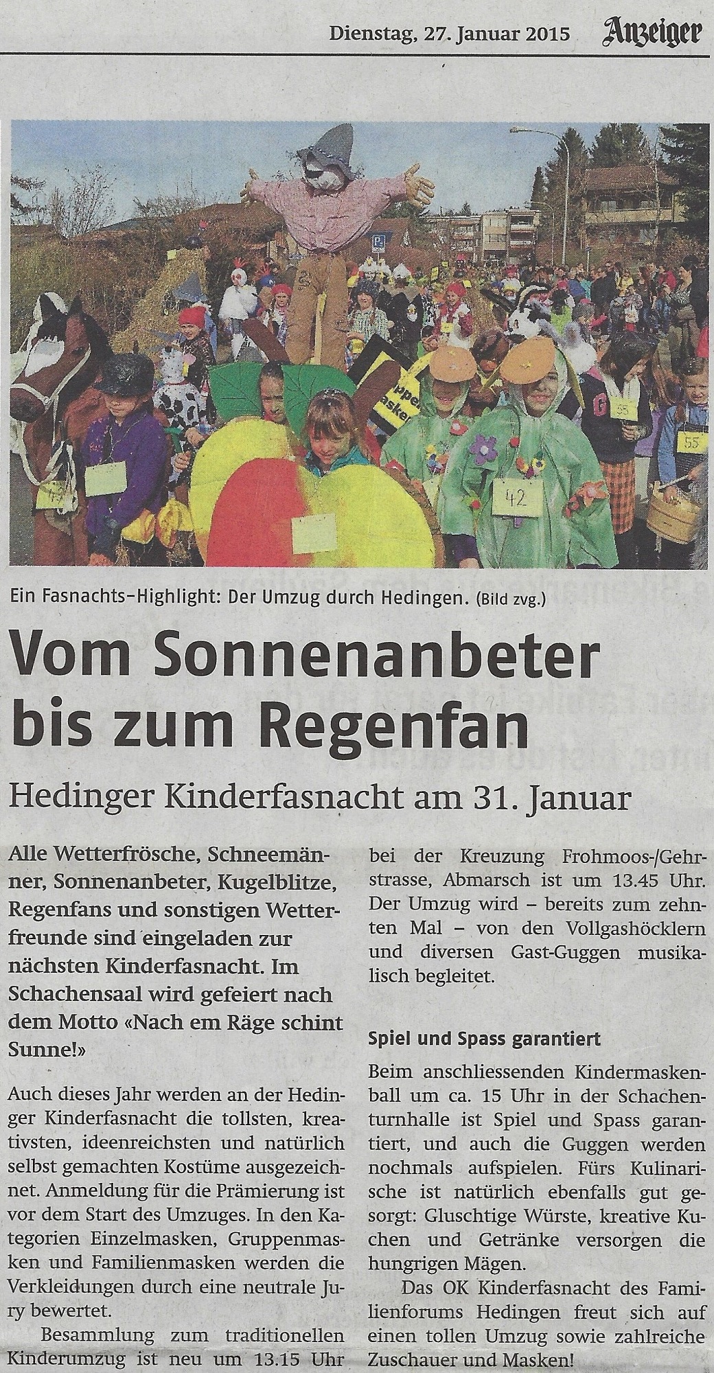 Dienstag, 2. Februar 2015 - Bericht im Anzeiger aus dem Bezirk Affoltern