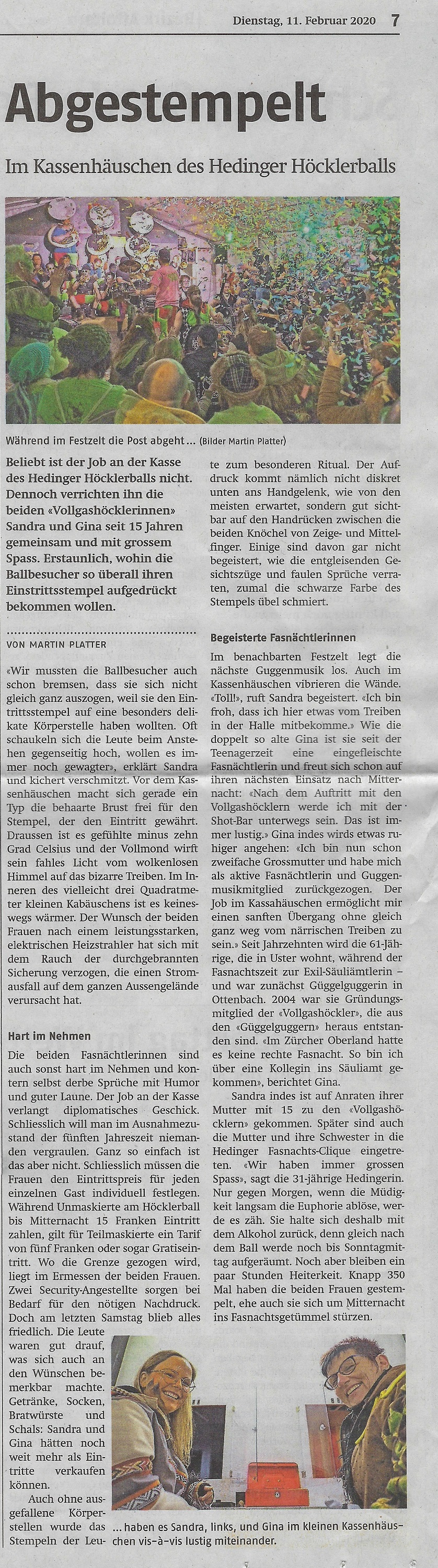Dienstag, 11. Februar 2020 - Bericht im Anzeiger aus dem Bezirk Affoltern